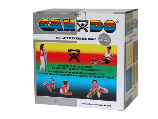 The CanDo exercise band is an economic solution for upper and lower body exercises that are simple, easy to do and can be performed anywhere. Lightweight, compact and portable, the Latex-free formula has been specially created to mimic the stretch characteristics of a latex band. This high quality, synthetic Latex-free band has been used for physical therapy and athletic training by clinics, fitness centers and individuals since 1987. This is a 25-yard roll of the Tan (XX Light) Band. Exercise bands are effective when used alone or with handles and anchors. Made with Tear-Stop technology for reduced puncture and "snap" breakage. They are a well-known staple of most physical therapy offices, clinics and gyms because they are durable, powderless and textured for easy gripping. The rolls have a core that fits most dispenser racks. The width is uniform across the bands at 5" wide. Bands are available in 8 levels of resistance for progressive exercise. Levels range in order of strength from least to greatest resistance: tan, yellow, red, green, blue, black, silver, gold.