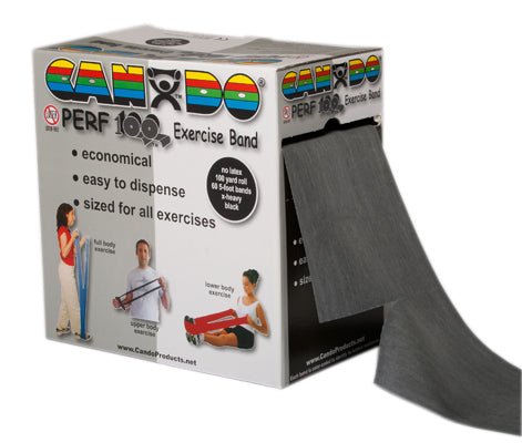 CanDo Perf 100 latex free economic bulk size roll is the best value for large clinics. The Perf 100 economic bulk size roll is the best value for large clinics and centers. The CanDo Perf 100 offers a true 100 yard roll of exercise band in a convenient dispenser box. The band is perforated every 5 feet. There are 60 5-foot exercisers in each roll. To prepare exercise band for use simply pull 5 foot length from dispenser box and separate perforation line by hand. No scissors are needed!