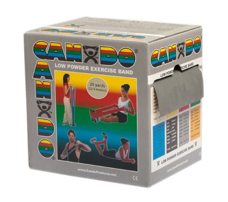 The CanDo Exercise Band is the premium exercise band solution, containing natural rubber Latex and all the functionality, stretchability and benefits that come with it. So versatile, these bands are super for upper and lower body exercises that are simple, easy to do and can be performed anywhere. Lightweight, compact and portable, the high quality and superior characteristics of these bands are why they are used in physical therapy and athletic training by clinics, fitness centers and individuals nationwide. This is a 25-yard roll of the Tan (XX Light) Band. Exercise bands are effective when used alone or with handles and anchors. Made with natural rubber Latex which may cause allergic reactions. They are a well-known staple of most physical therapy offices, clinics and gyms because they are durable, powderless and textured for easy gripping. The 25-yard rolls can be used in all dispenser systems/racks. Bands are available in 8 levels of resistance for progressive exercise. Levels range in order of strength from least to greatest resistance: tan, yellow, red, green, blue, black, silver, gold.