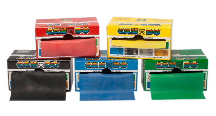 The CanDo Exercise Band is the premium exercise band solution, containing natural rubber Latex and all the functionality, stretchability and benefits that come with it. So versatile, these bands are super for upper and lower body exercises that are simple, easy to do and can be performed anywhere. Lightweight, compact and portable, the high quality and superior characteristics of these bands are why they are used in physical therapy and athletic training by clinics, fitness centers and individuals nationwide. This is a 5-piece set featuring 1 (one) 6-yard roll of the Yellow, Red, Green, Blue and Black Bands. Exercise bands are effective when used alone or with handles and anchors. Made with natural rubber Latex which may cause allergic reactions. They are a well-known staple of most physical therapy offices, clinics and gyms because they are durable, powderless and textured for easy gripping. The 6-yard rolls come ready to use in a dispenser box. Bands are available in 8 levels of resistance for progressive exercise. Levels range in order of strength from least to greatest resistance: tan, yellow, red, green, blue, black, silver, gold.