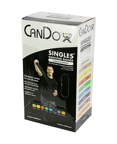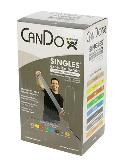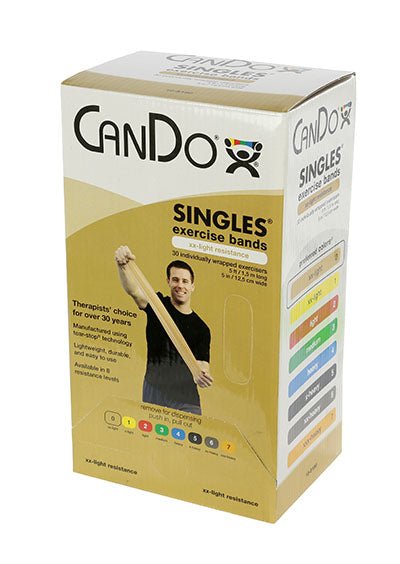 CanDo is licensed to use the Thera-Band color sequence so resistance level is easily identified. Available in 8 levels of resistance for progressive exercise. Levels range in order of resistance from least to greatest resistance: tan, yellow, red, green, blue, black, silver, gold. Each band is 5 inches wide and 5 feet long. CanDo low powder exercise band is made of natural rubber latex, which may cause allergic reactions. For those with latex sensitivities, there are latex-free alternative offerings of CanDo exercise band. The tan band is XX-Light in resistance and comes in a 30 piece dispenser.