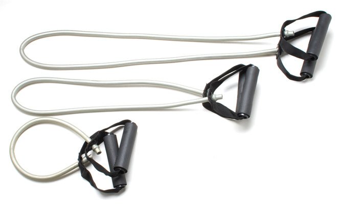 Lightweight, compact and portable, the tubing exerciser helps perform strengthening and conditioning workouts on-the-go, even in your hotel room! Two permanent foam covered rigid handles give the exerciser comfort and a firm grasp. CanDo is licensed to use the Thera-Band color sequence so resistance level is easily identified. The tubing with handles exerciser is available in 7 levels of resistance for progressive exercise and 3 lengths to accommodate different needs. Levels range in order of strength from least to greatest resistance: tan, yellow, red, green, blue, black, silver. Length represents length of tubing from end to end when unit is laid flat and is taut. CanDo low powder exercise tubing is made of natural rubber latex, which may cause allergic reactions.