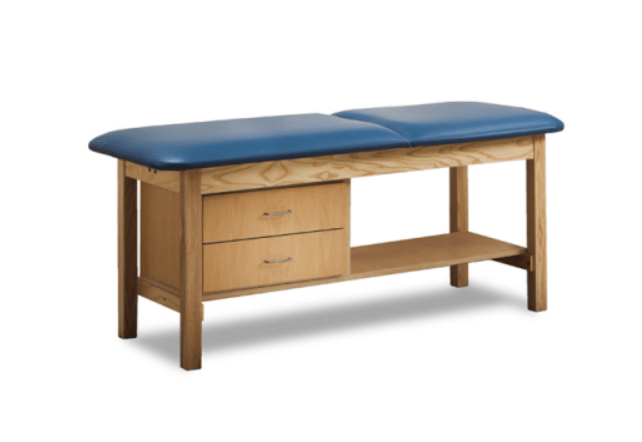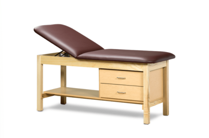 - Features hardwood legs, laminate shelf, two easy clean, plastic drawers and adjustable backrest