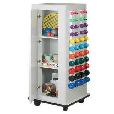 4 sided storage cabinet has a place for dumbbells, cuff weights, exercise bands (with core) and exercise tubing. 4" swivel casters (2 locking). Large interior space with door. Mirror has polished edges and ANSI safety backing.