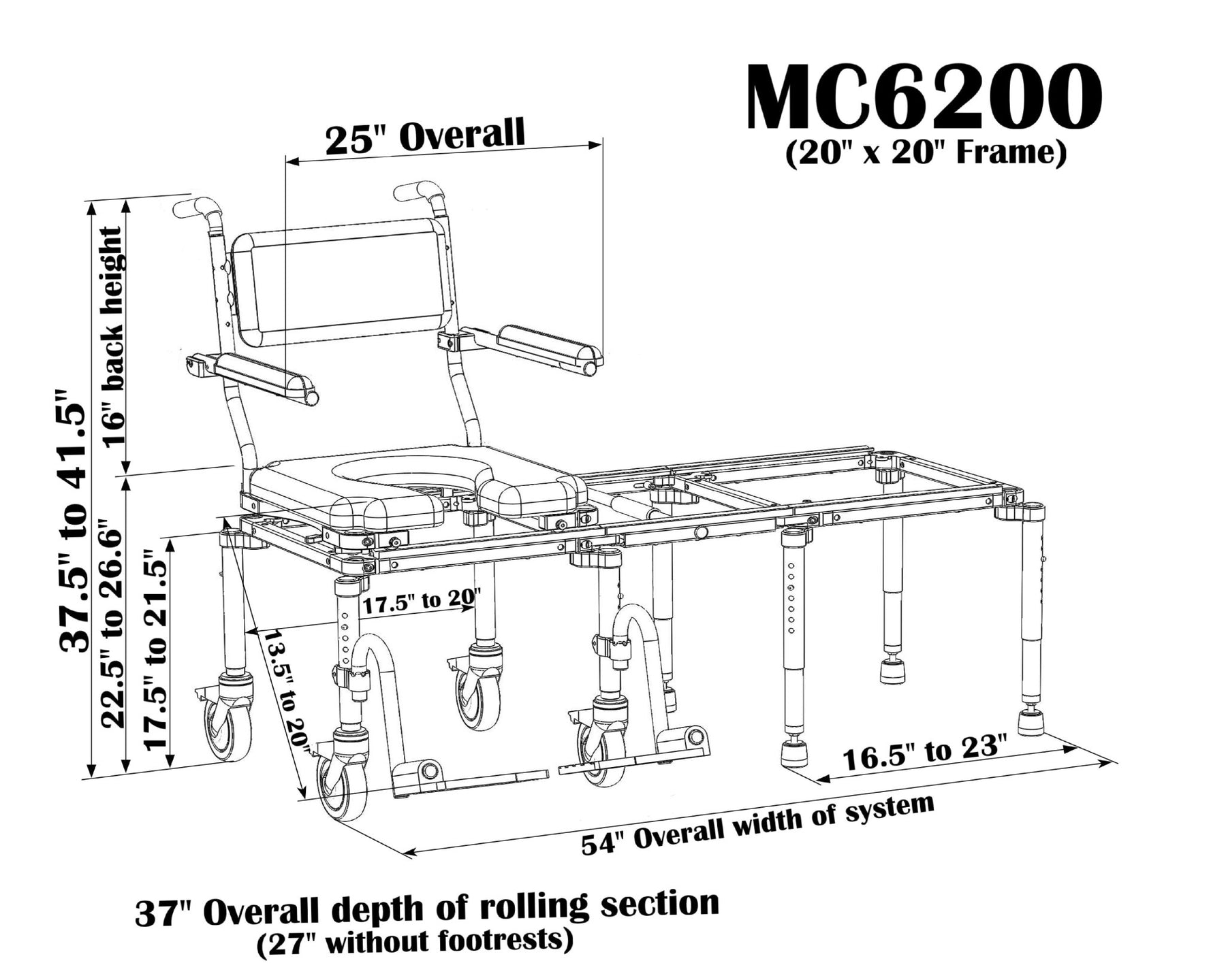A commode chair, tub access slider system, and in-home mobility chair in one complete unit. Requiring just one bedside transfer, the MC6200 eliminates the need for transfers onto toilets and into tubs in the dangerous bathroom environment. This model features a larger 20″x20″ seat frame and 400lb capacity for customers needing more space and support. Safe and convenient, the system includes the smoothest rolling transfer system available on the market.