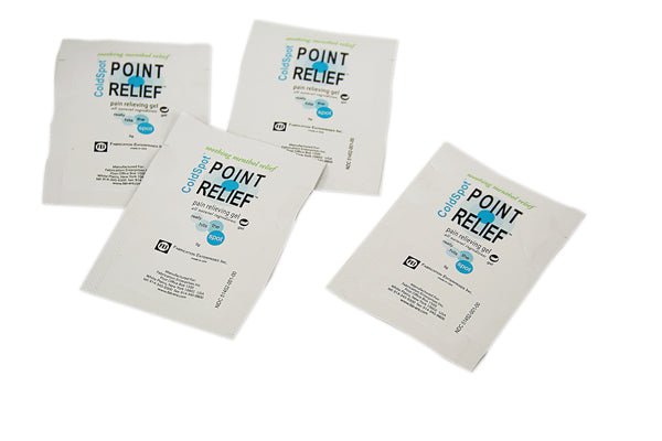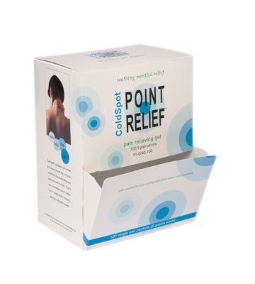 Point Relief ColdSpot topical analgesics are available with gel, roll-on and spray applicators. The over-the-counter formulas offers fast-acting, soothing, temporary relief of minor aches and pains of muscles and joints associated with simple backache, arthritis, bruises, strains and sprains. Water-based formula minimizes grease and residue. ColdSpot includes all natural ingredients including menthol, MSM, ilex, and arnica. Has refreshing Peppermint scent. Point Relief ColdSpot has a high active menthol concentration compared to some other leading brands.
