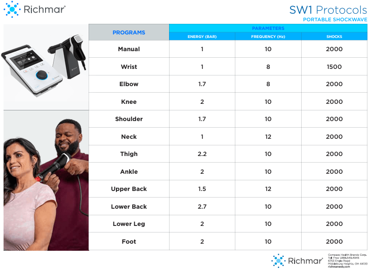 11 Preset Body Part Protocols: This unit comes pre-programmed with 11 Preset Body Part Protocols (Wrist, Elbow, Knee, Shoulder, Neck, Thigh, Ankle, Upper Back, Lower Back, Lower Leg and Foot) that were carefully programmed according to ISMST (International Society for Medical Shockwave Treatment) Guidelines and clinical testing.