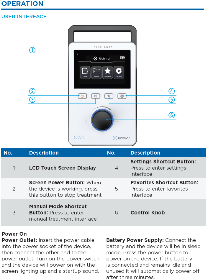 Intuitive Touch Screen: The TheraTouch SW1 features a rather intuitive and simple-to-use touch screen interface. This device features many options and capabilities, giving the user the ability to operate the device however they deem necessary for treatment! Additionally, the interface is trilingual, supporting English, Spanish, and French