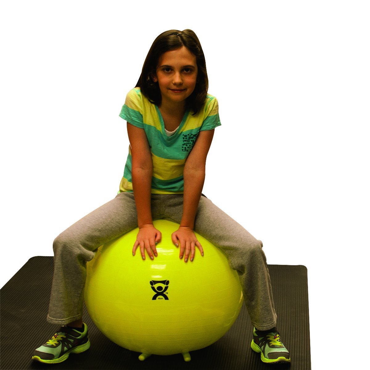 Unique inflatable ball has stabilizing "feet" that keep the ball from rolling when not in use. When in use the weight of the person makes the "feet" retract into the ball so it can function like any other inflatable exercise ball. Non-slip surface is ribbed for extra security. Under inflate to give a soft, mushy feel or fully inflate for a firm, bouncy feel.
