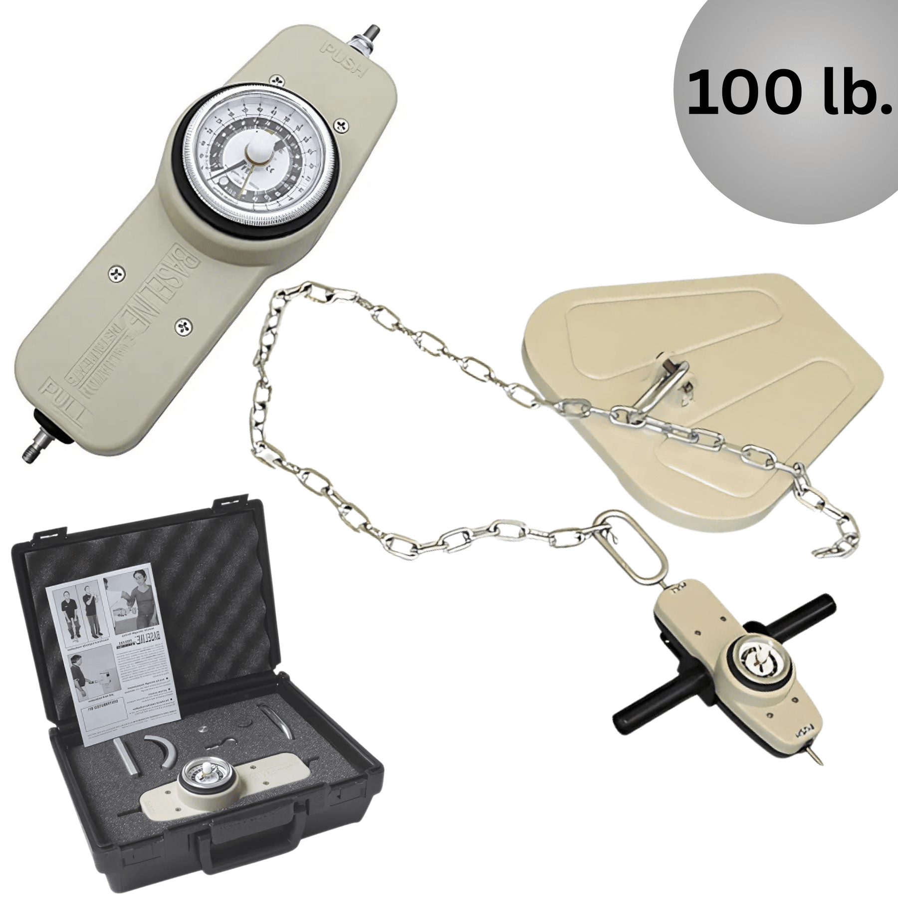 The Baseline MMT Hydraulic Push-Pull Dynamometer with Analog Gauge can be purchased with a 50 lb, 100 lb, 250 lb, or 500 lb capacity. The maximum reading on the analog gauge remains until the unit is reset. The Baseline MMT Dynamometer is perfect for muscle strength measurement, job task analysis and functional capacity evaluation (FCE). The Baseline MMT Dynamometer is designed to be lightweight and portable. Packaged with 3 push pads (padded curved, padded straight, and circular), 1 pull hook and 1 snap-lock hook.
