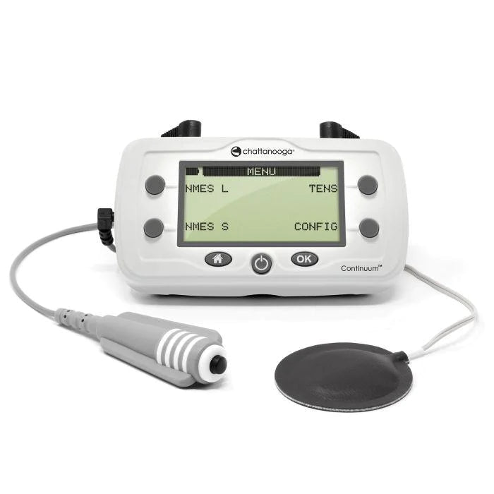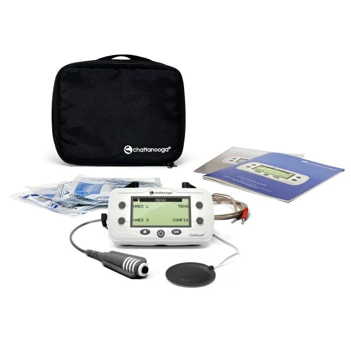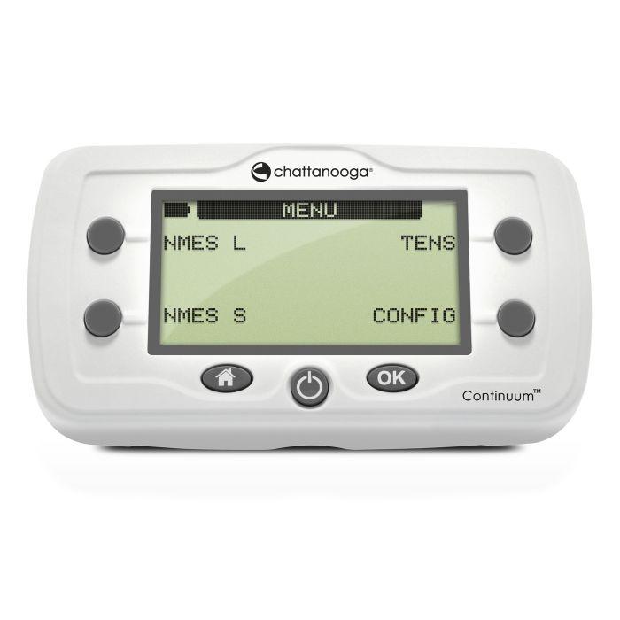 The Chattanooga Continuum is a portable 2 channel stimulator used by therapists in clinics and patients at home to provide electrical stimulation treatments in pain management (TENS) and neuro muscular stimulation (EMS/NMES).