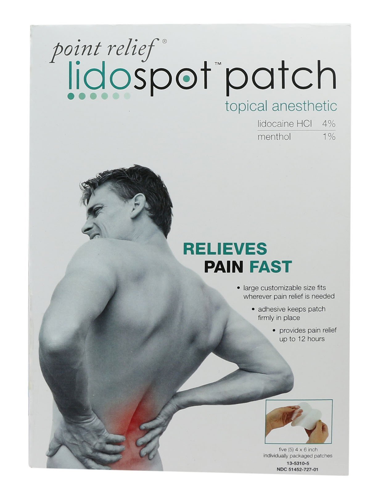LidoSpot pain relieving patches provide long-lasting pain relief from back, neck, joint and muscle aches, soreness, pain and discomfort. Each patch contains the highest permissible amount of lidocaine (4%) without a prescription and 1% menthol. The patches prevent nerves from sending pain impulses to the brain, providing relief when it's needed most. Used after pain treatment regimens, the patches provide relief for up to 12 hours. This is a pack of 5 patches. At 4"x6", the patch is large enough to fit areas such as the back or thigh. Ideal to use during pain-treatment regimens to provide temporary relief. The patches can easily be cut to a customized size and shape for hard to treat areas such as the wrist or elbow. Strong adhesive ensures the patch stays on during physical activity. These transdermal patches are non-habit forming.