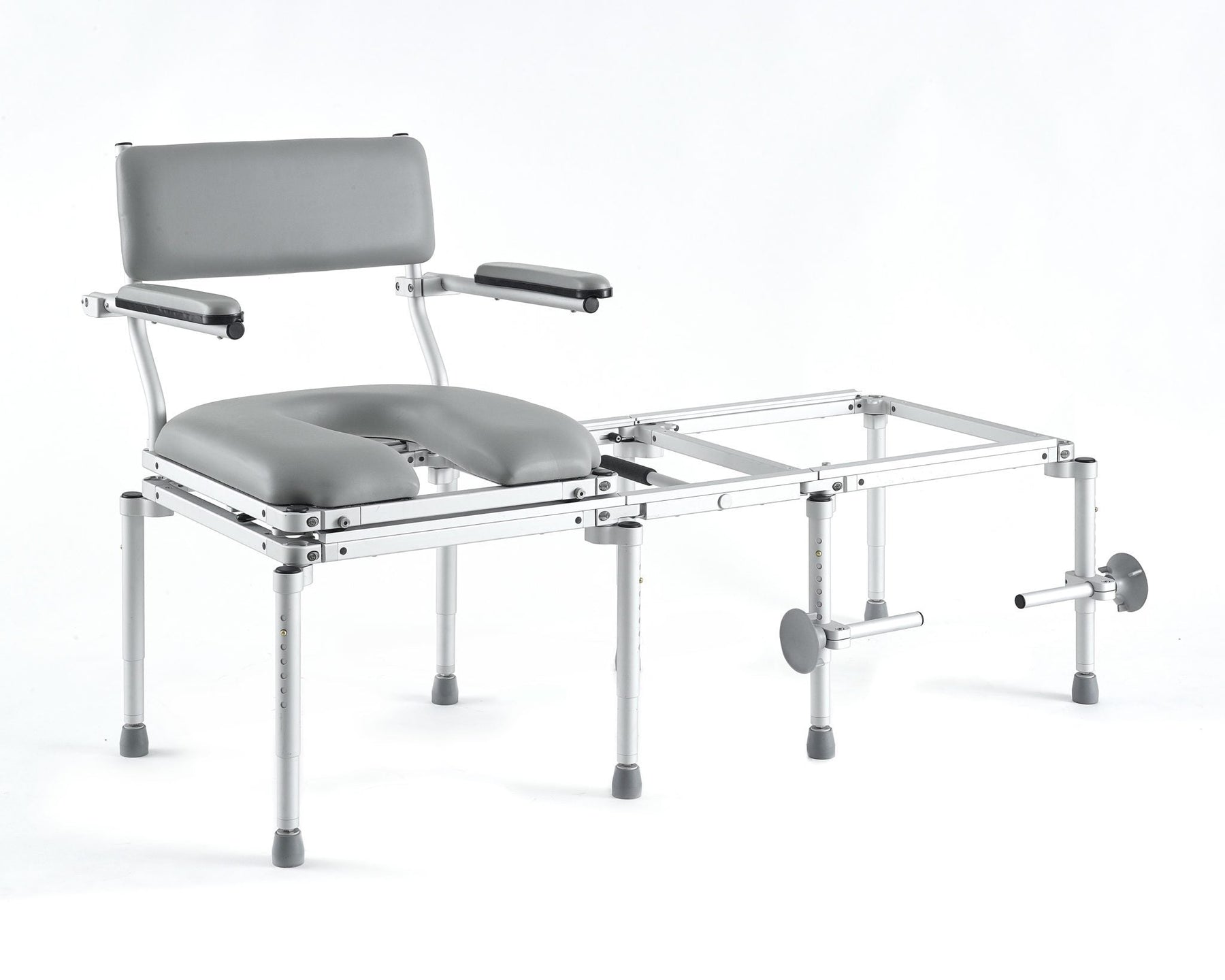 This all-in-one stationary commode chair, shower chair, and transfer system was designed for independent wheelchair users who cannot access the tub because the toilet is in the way, or for able-bodied walkers not comfortable rotating their hips as required to use a traditional stationary transfer bench. This model has a larger seat frame and a 400lb capacity for customers needing more space and support.
