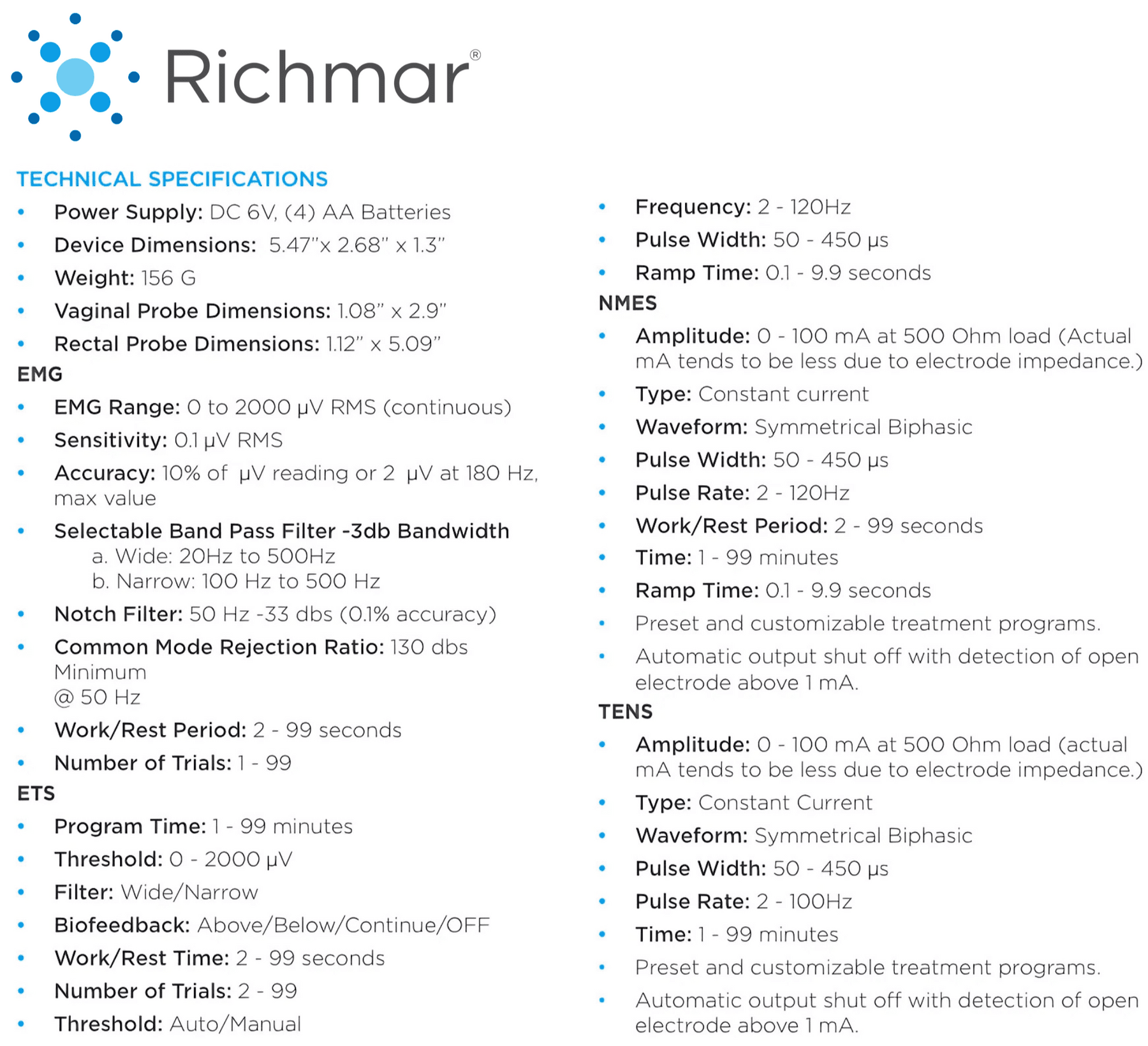 - User Friendly Interface: The Richmar EMG Pro was designed with a user friendly interface with colored matrix display that makes this unit simple and easy to use.