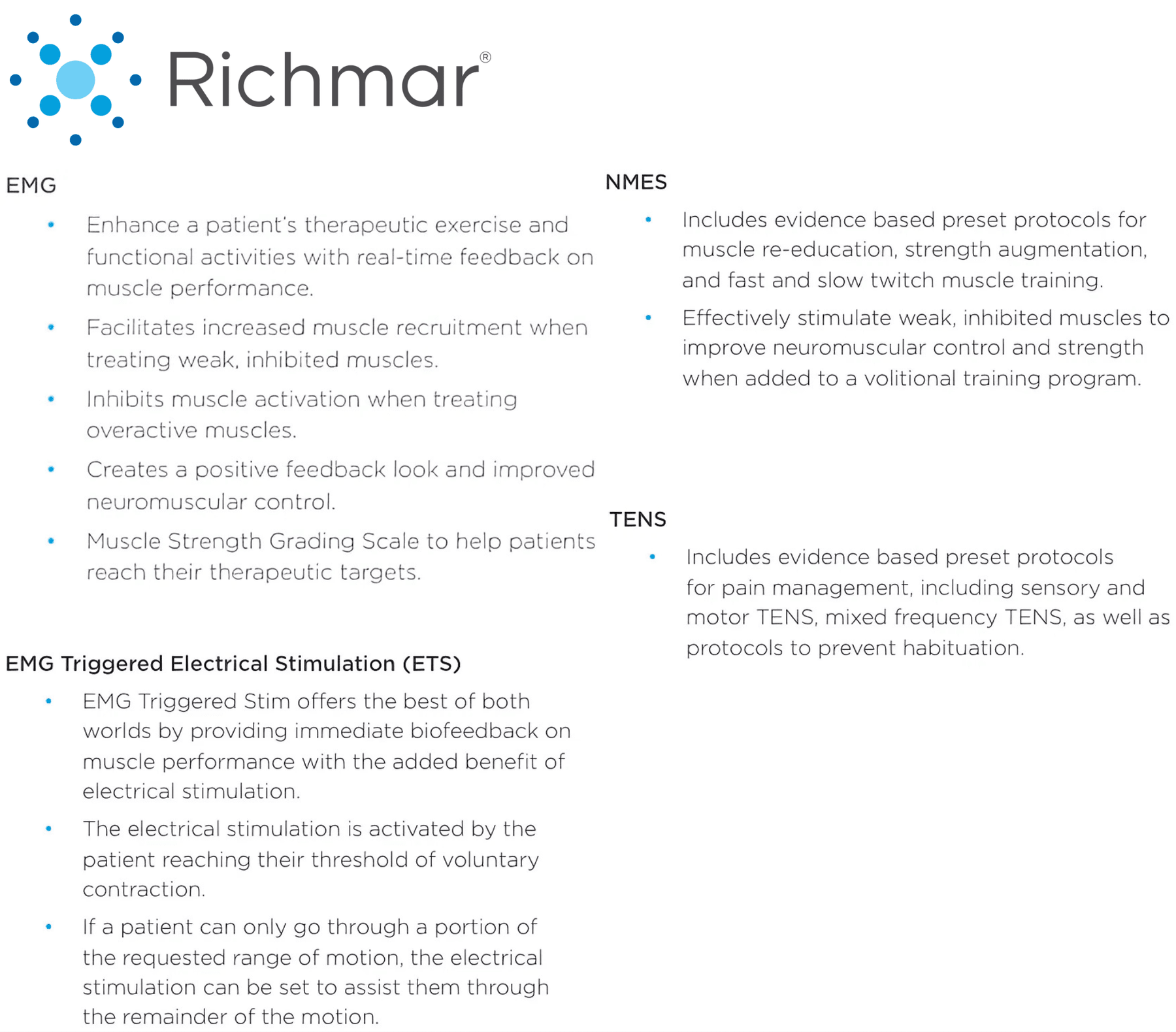 Evidence Based Preset Protocols: The Richmar EMG Pro features over 30 evidence based preset protocols to guide and assist clinicians in treatment and offer versatile, comprehensive rehabilitation therapies, including: