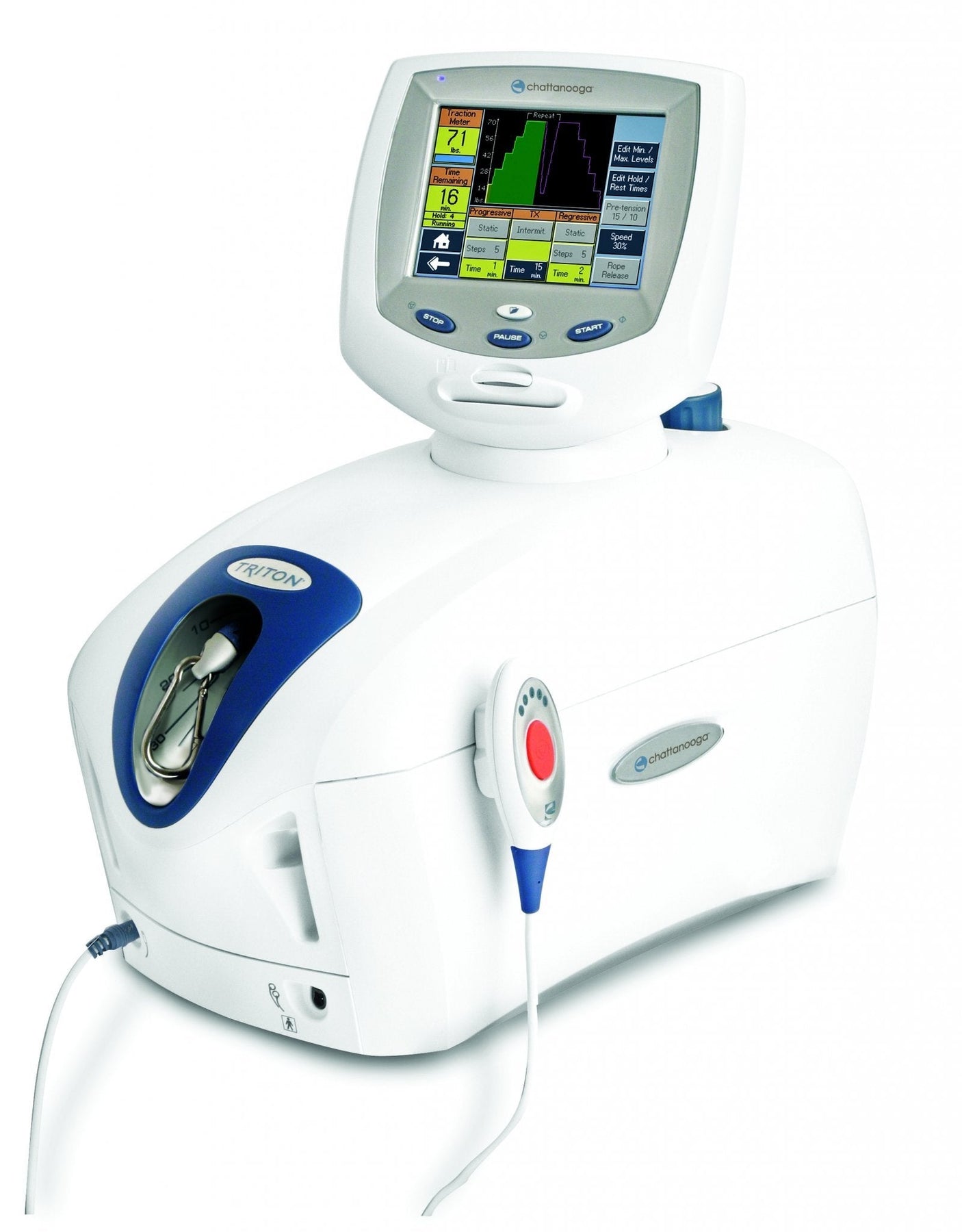 The Triton Traction Unit is easy to operate. Has a 270° Pivoting User Interface, with a Digital Monochromatic Touch Screen Interface. The Patient Data Cards record up to 14 treatment sessions and can store up to 10 user defined protocols. The TX Traction Unit has Intermittent, Static and Cyclic Traction, Progressive and Regressive steps. User-defined Hold, Rest and Treatment times. The Traction tension parameters: 0-200 lbs.