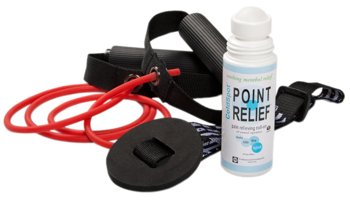 CanDo exercise tubing is an economic solution for upper and lower body exercise. Lightweight, compact and portable. Durable. Effective when used alone, or with handles and anchors. CanDo low powder exercise tubing is made of natural rubber latex, which may cause allergic reactions. For those with latex sensitivities, there are latex-free alternative offerings of CanDo exercise band. Kit also includes door anchor accessory to facilitate exercise described in the pamphlet. Kit also includes 3 ounce roll-on bottle of ColdSpot topical analgesic lotion. Point Relief ColdSpot topical analgesic roll-on offers fast-acting, soothing, temporary relief of minor aches and pains of muscles and joints associated with simple backache, arthritis, bruises, strains and sprains. Water-based formula minimizes grease and residue. All natural ingredients including menthol, MSM, ilex, and arnica. Has refreshing Peppermint scent.
