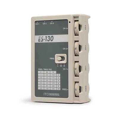 Introducing the ITO ES-130! A portable electrotherapy unit with 3 independent output channels. This new model is designed and calibrated to meet all essential safety and regulatory industry standards. With its fresh new look, the ES-130 is a compact, sturdy, high quality Japanese electro-therapy device that is light weight and fits in the palm of your hand. Featuring a High/Low switch on the back of the unit, the switch is toggled too Low to facilitate use with needles or too High for MEA electro-therapy. The low setting is used in conjunction with standard acupuncture needles for an electrotherapeutic acupuncture experience. The high setting is used for standard electrotherapy sessions and is easy to control with its three independent channel controls for fluctuating therapy options.