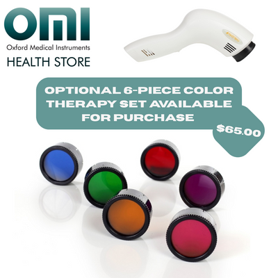 Optional Color Therapy Set: This device can be optionally purchased with the 6-Piece Set of colored lenses (Red, Blue, Orange, Green, Pink, Violet) which enables the user to switch the colors out to improve well-being.
