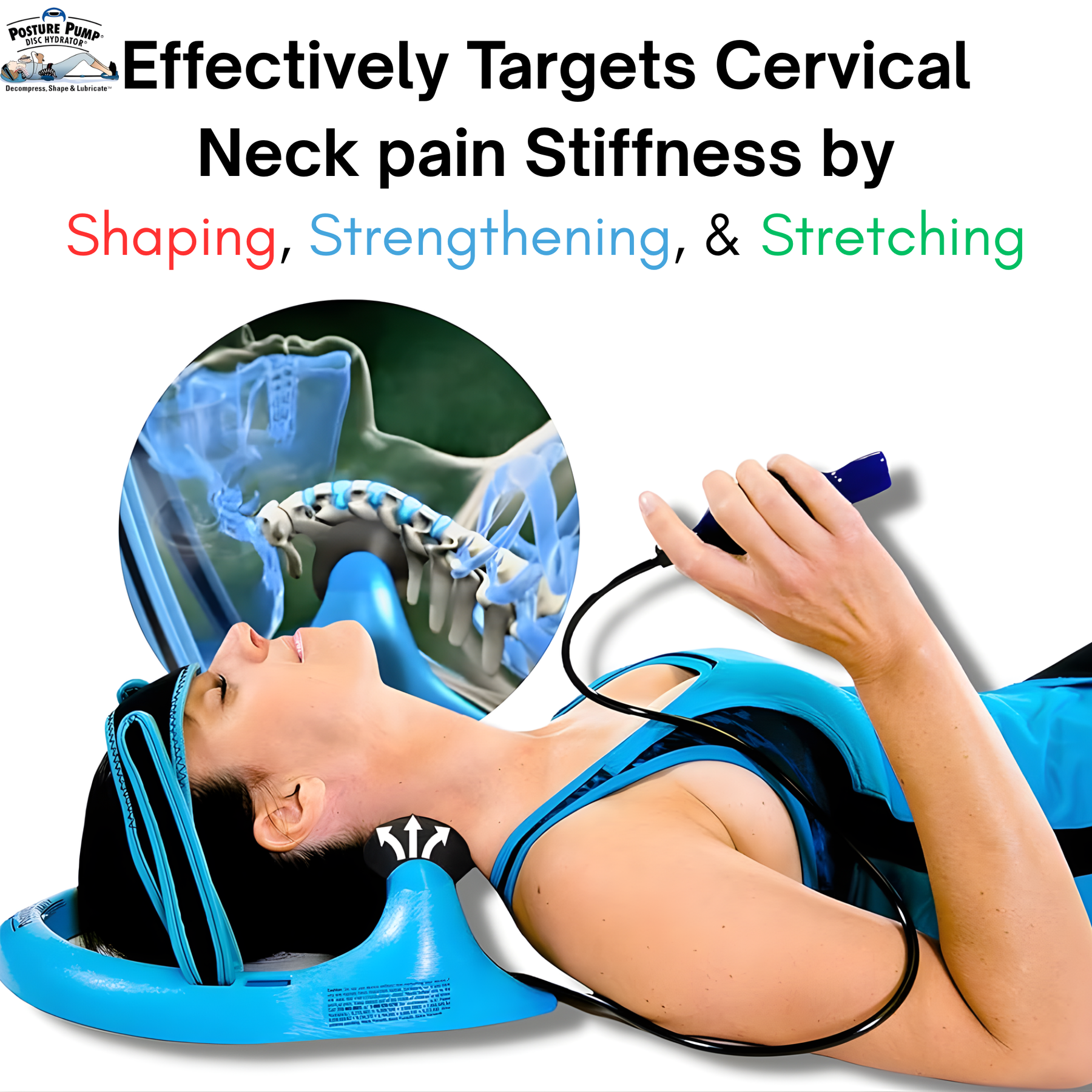 The Posture Pump 1100-S is a portable, handheld-pump spinal traction device designed to gently decompress, hydrate, and restore the natural cervical (neck) curve — all from the comfort of your home. Using patented air-cell technology called “Expanding Ellipsoidal Decompression (EED)”, the device applies gentle, multi-vector traction to your neck vertebrae to relieve pressure on discs and joints.