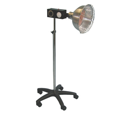 Mobile lamp with variable control. Adjustable 31" -52". Extends 15" over bed. Designed for use in hospitals, clinics and large practices. Equipped with 3 conductor cord sets with hospital grade plugs, a control panel that houses an on/off indicator light and either an intensity control and 30 minute timer switch. 750W ceramic heating element electromagnetically transmits extremely uniform heat to the patient. Unit changes from coral to gray when energized. No visible light produced. Nickel-chromium resistance wire embedded into a ceramic casting provides uniform heat transmission, 96% thermal efficiency with low element surface temperature. Inner body of the element is filled with ceramic fiber insulation, which conserves energy, maximizes efficiency and minimizes heat build-up at the terminal area. Heat up time is 3 - 9 minutes to reach 90 degrees of maximum temperature. 110V.