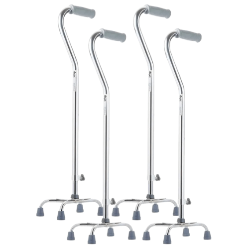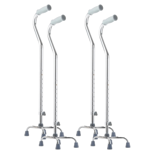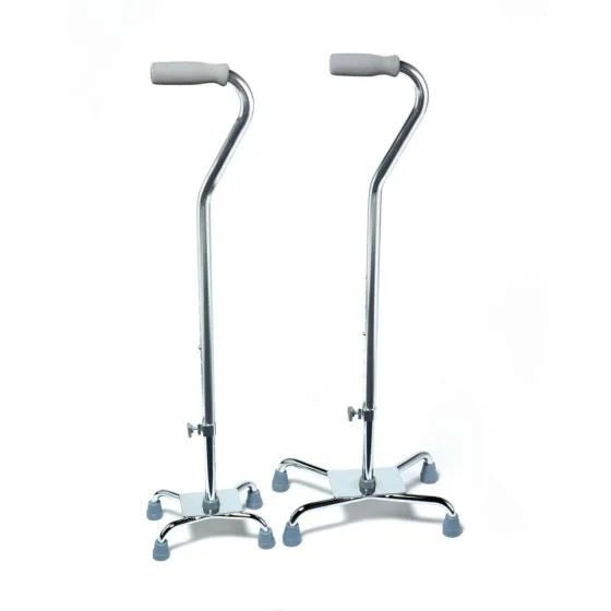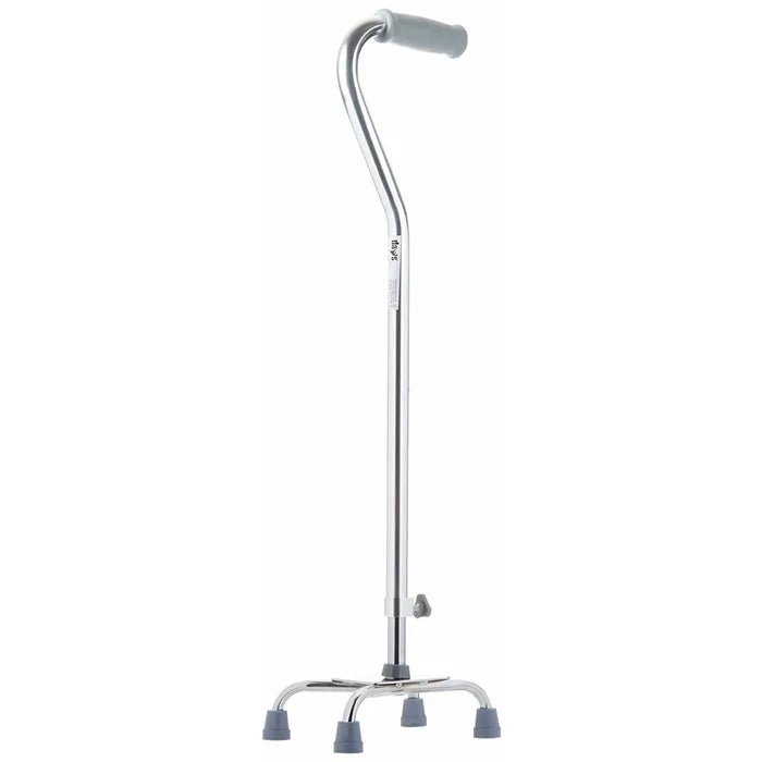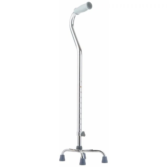 The Quad Cane has a 4 point small or large base, combined with offset handles that provides additional stability and support. Easy-to-use, one-button height adjustment with locking bolt, allows quick, safe fitting. No assembly required.