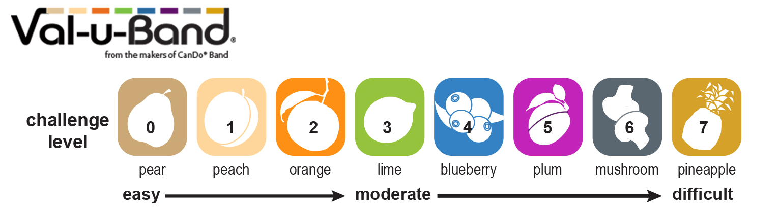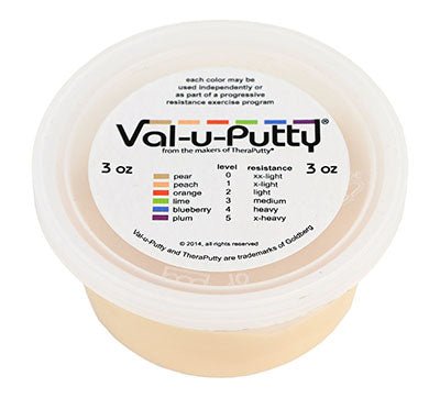 Val-u-Putty has the same great feel as the traditional CanDo Theraputty hand exercise material. Available in 6 resistance levels. Val-u-Putty is available in Berry Colors. Each color-coded putty has a different consistency ranging from xx-soft for strengthening the weakest grasp to x-firm for developing a stronger grip. The putty material is gluten, casein and latex free.